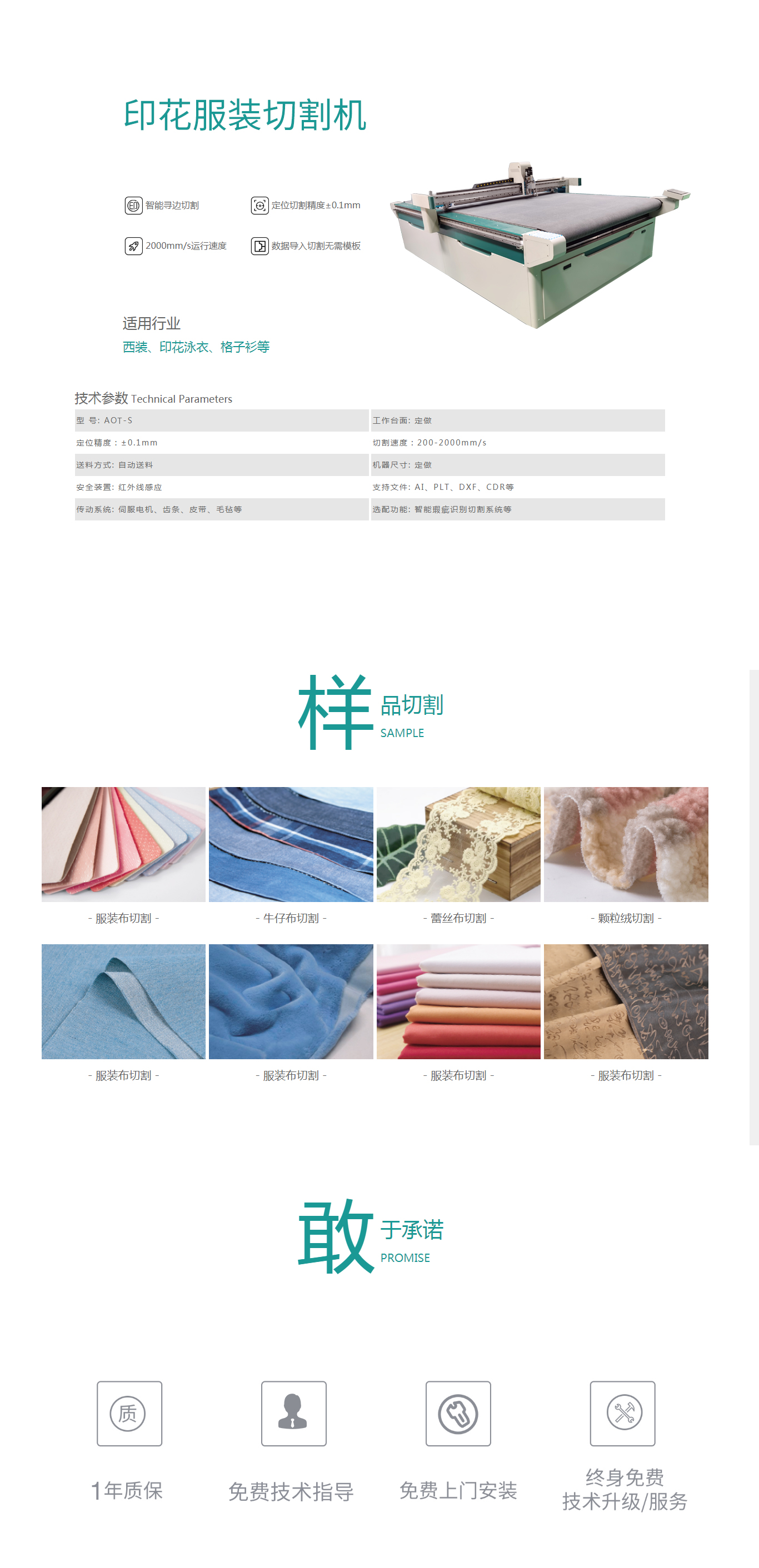 我們的主要産品有:振動刀切割機、氣動刀切割機、旋轉刀切割機等,廣泛應用於(yú)汽車内飾加工行業(汽車腳墊、後備(bèi)箱墊、座套、皮座椅、把套、遮光墊、鑰匙衣、車貼等)以及毛絨玩具、家居家紡、服裝服飾、沙發、窗簾、鞋業、箱包、廣告、婚慶用品、工藝品、四氟墊等行業。